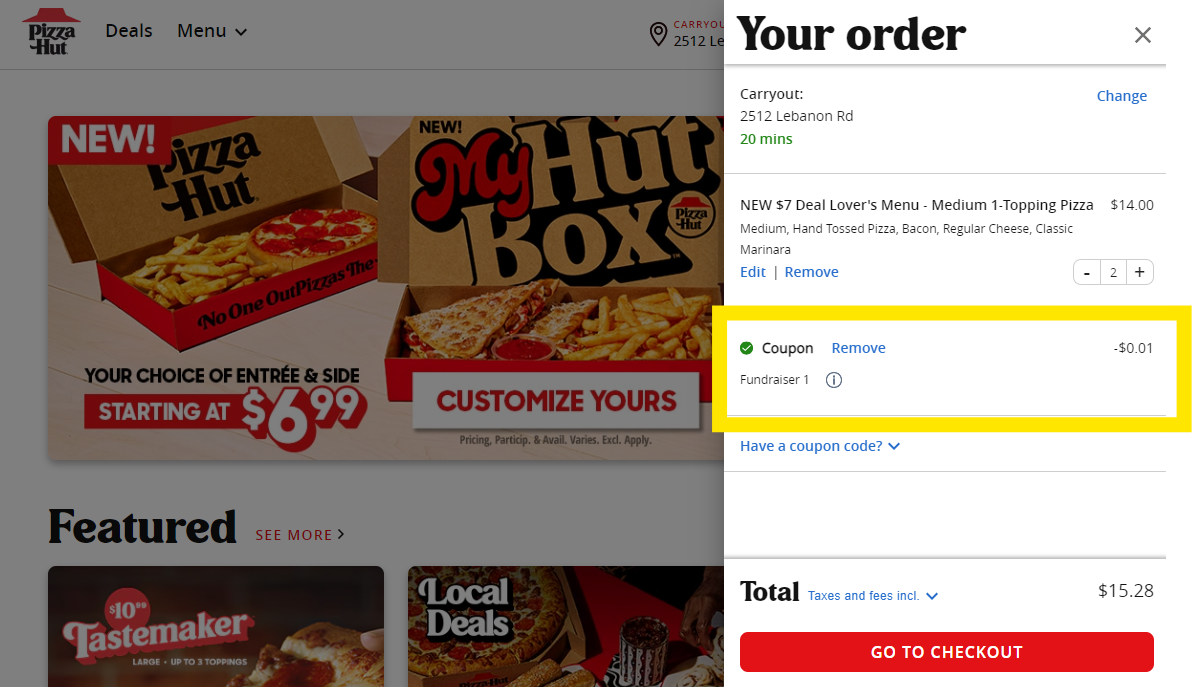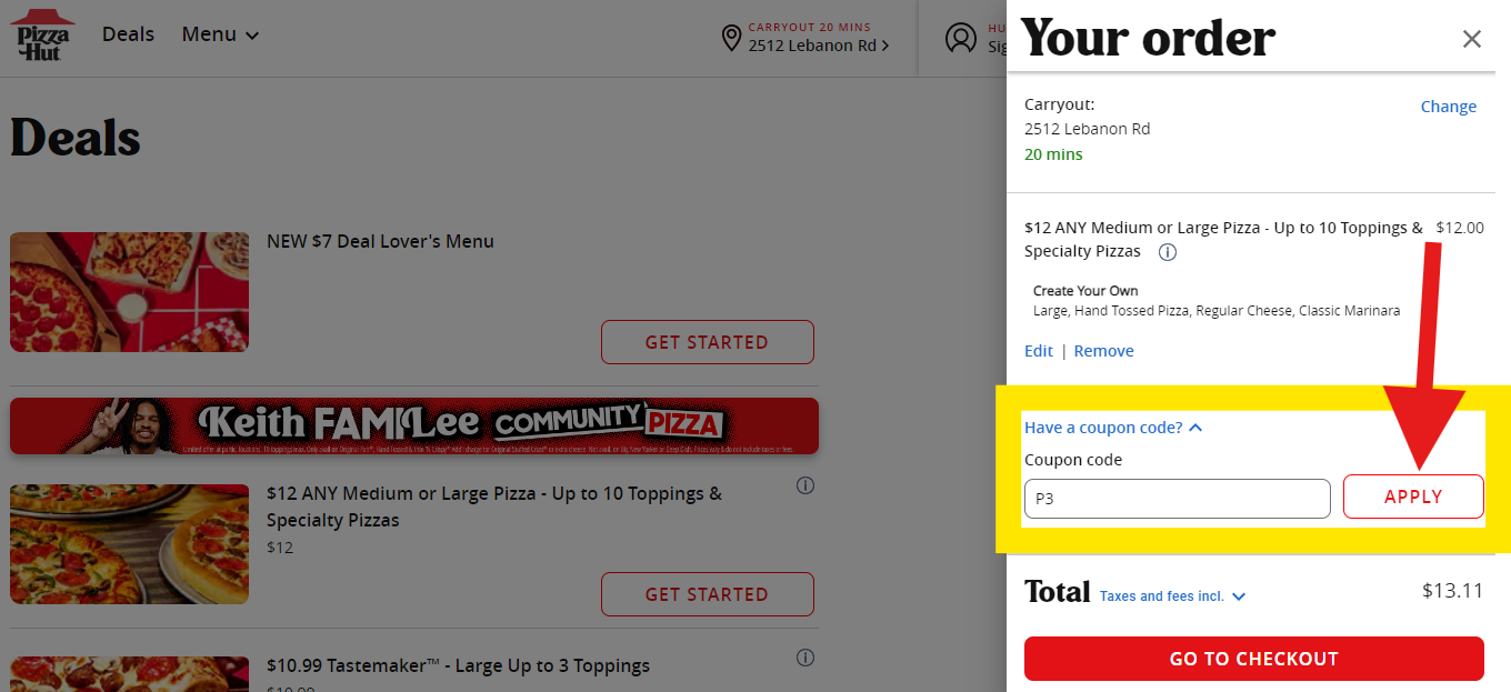 At our Donelson Pizza Hut you may place an order in person, on the phone, or online using our Coupon Code P3. Applies to Delivery, Carryout and Dine-in orders!