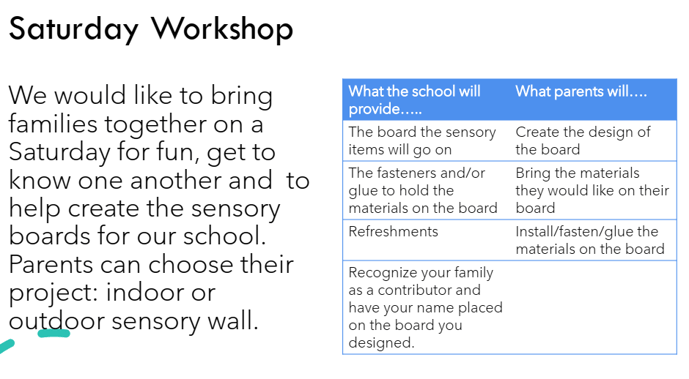 Ms. Gonzalez also discussed the desire to have a workshop with volunteer families to help create 8 4X5 Sensory walls for indoor and outdoor use to help with the students' needs. She explained what sensory walls are and the importance of the sense of touch with children in their development both emotionally and educationally. Ms. Gonzalez would like to host a workshop for families interested in helping create the walls on Saturday May 18. Pennington has purchased the peg board walls and families can collect and provide the materials and design of the walls. A sign up will be posted in the school Facebook group and is also available here. View the Sensory Board Presentation